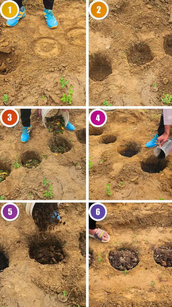 After placing organic scraps and crushed charcoal into the hole, covering them with manure or compost creates balance. Compost acts as a buffer, preventing raw organic matter from directly contacting plant roots later on. It also introduces beneficial microbes that speed up decomposition.