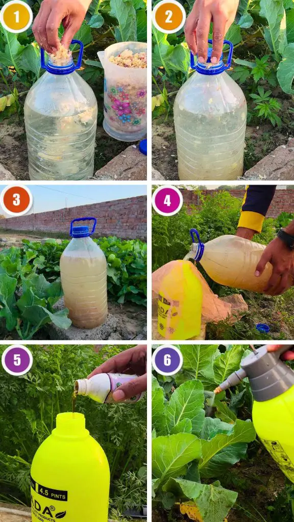 Once the liquid is strained, transfer it into a sprayer bottle. Adding neem oil at this stage enhances the spray’s effectiveness. Neem oil is known for its natural insect-repelling properties and works well alongside the strong aroma of ginger and garlic.