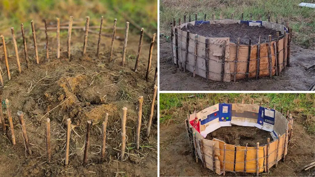 Even though bamboo makes a good wall, soil can sometimes leak out through small gaps. To prevent this, we use old cardboard containers as an extra layer. Place flattened cardboard sheets inside the bamboo circle, overlapping them so no soil escapes.
