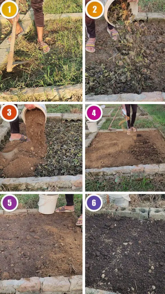 After spreading the leaves, the next step is to add a good, thick layer of dry garden soil. This step is crucial for two main reasons. First, the dry soil absorbs excess moisture still trapped in the bed. It helps balance the wetness left behind after the monsoon and allows the soil to dry out gradually without becoming hard or cracked. Second, it helps raise the level of the bed.