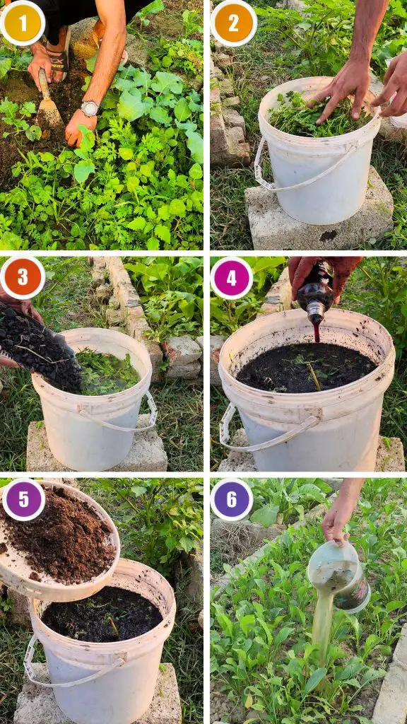The fermentation process takes around seven to ten days, depending on temperature and humidity. During this period, the microbes will continue breaking down the organic materials, turning the weeds and compost into a concentrated nutrient solution.