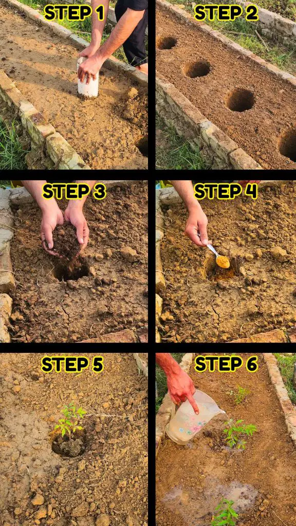 Once the soil is ready, the next step is making planting holes. A simple and effective method is to use an old plastic pipe. Push the pipe into the soil about half a foot deep, twist it slightly, and then remove it. This creates a clean, uniform hole and brings out a small amount of soil, which can be used later around the plant.