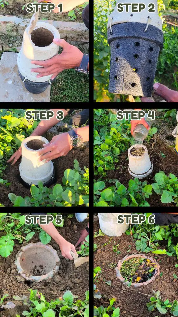 The installation process is the same: dig a hole, place the pot inside, and fill it with alternating layers of compost and organic waste. Cover the top with mulch. Over time, nutrients from the compost leach into the surrounding soil, nourishing nearby plants naturally.