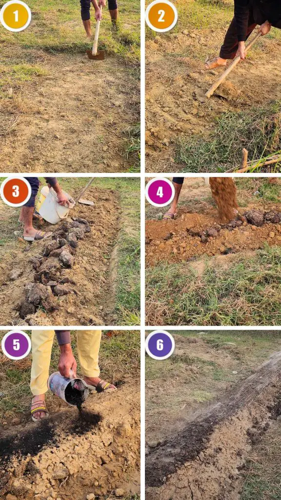 Cow dung is an excellent natural fertilizer, full of nutrients that support plant growth. However, sometimes it dries into hard pieces that are difficult to break apart. Instead of trying to crush them into powder, we place the chunks directly on the dug-up bed.