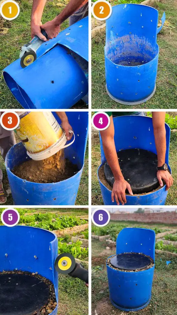 Press it down so it fits snugly inside the barrel’s seating area. This serves multiple purposes: it protects the soil from erosion during rain, creates a flat surface for sitting, and adds extra weight and strength to the chair.